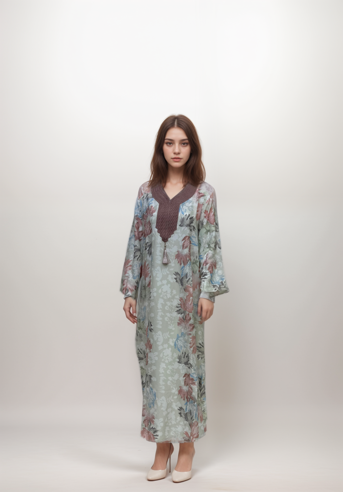 الأسئلة الشائعة حول جلابية بيج فاتح نسائي طويلة بنقشة زهور: